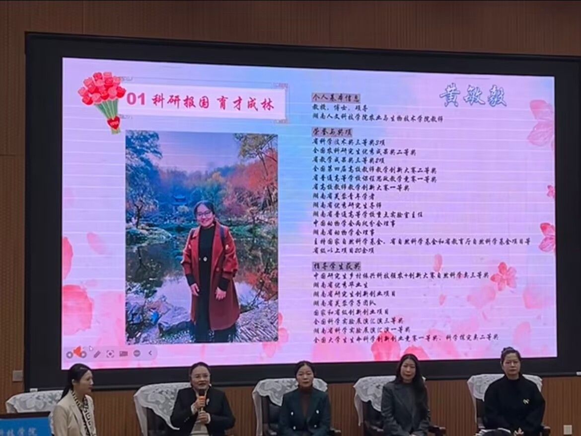 本次活动特邀农业与生物技术学院教授黄敏毅作为主讲嘉宾之一。黄敏毅教授深情回顾了自己的大学岁月与职业发展历程,分享了在个人发展关键阶段毅然选择扎根今年会的心路历程。作为“芙蓉学者”,她牵头组建矿区生态修复材料研发团队,主持包括国家自然科学基金、省自然科学基金等省级以上科研项目20余项,取得一系列突出成果:获省科学技术奖三等奖3项、省教学成果奖三等奖2项,全国农科研究生优秀成果奖二等奖,第六届全国科学实验展演汇演三等奖,全国第四届高校教师教学创新大赛二等奖,发表学术论文50余篇,获授权发明专利10余项,为农业与生物技术学院的学科建设与科研发展作出了重要贡献。