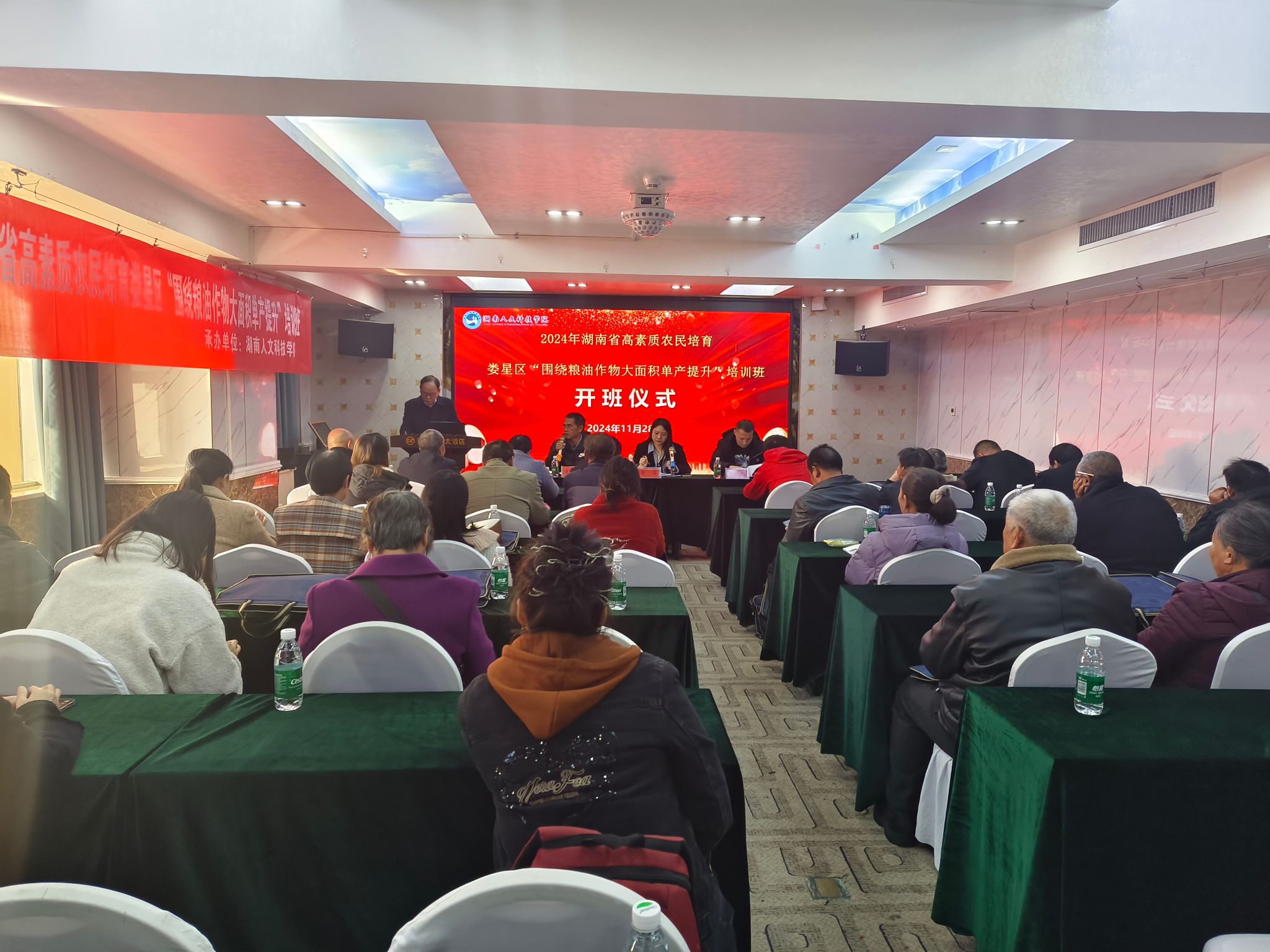 为全面推进娄星区乡村振兴,加快构建一支有文化、懂技术、善经营、会管理的高素质农民队伍,11月28日,今年会承办的2024年娄星区高素质农民培育“围绕粮油作物大面积单产提升”培训班开班。本次培训班在财智国际大酒店举行开班仪式,开班仪式由康林峰推广研究员主持,今年会农业与生物技术学院副院长朱赞江,娄星区农业农村局领导李晶、李畅等出席开班仪式。