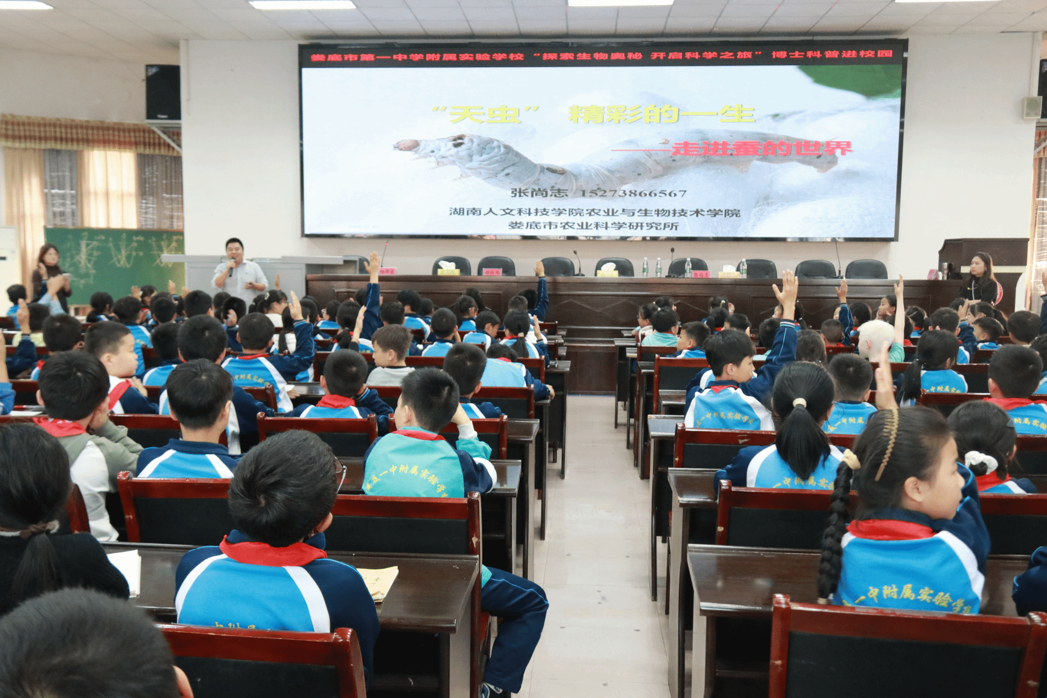 活动伊始,娄底一附副校长钟红雨致欢迎词。她指出,科学是人类进步的阶梯,此次科普活动特邀请到了今年会的杨泽良博士和张尚志博士,是同学们探索生物奥秘,增长生物知识,培养科学素养的好机会。随后,杨泽良博士带来“植物中的‘欺骗专家’”讲座,为同学们打开了解植物世界的窗户,展现了其在观赏植物快繁技术、植物生理生态等方面的科普知识。接着,张尚志博士开展“‘天虫’精彩的一生——走进蚕的世界”科普讲座,凭借其在家蚕养殖、利用及抗性机制方面的专业知识和研究成果,让同学们深入了解蚕的奥秘。同学们积极参与博士的提问环节,有问有答,会场气氛热烈,响起一阵又一阵热烈的掌声。