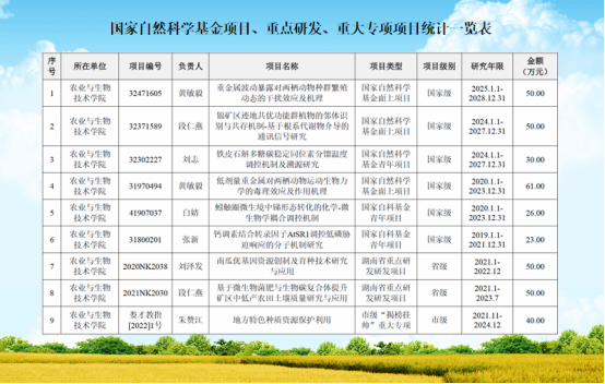 科学研究:2019年以来获省级以上纵向项目120项,其中,国家自然科学基金项目6项,省科技厅重点研发项目2项。获国家级、省级、市级科技成果奖10项,其中,国家科技进步二等奖1项,省科学技术创新团队奖1项,省科技发明一等奖1项,省部级科技进步奖3项,全国农业丰收奖二等奖1项,省农业丰收奖二等奖1项;湖南省教学成果二等奖1项、三等奖2项;选育农作物新品种(组合)1个;获国家发明专利49项;通过省级成果鉴定3项;发表论文444篇,其中SCI收录论文139篇。