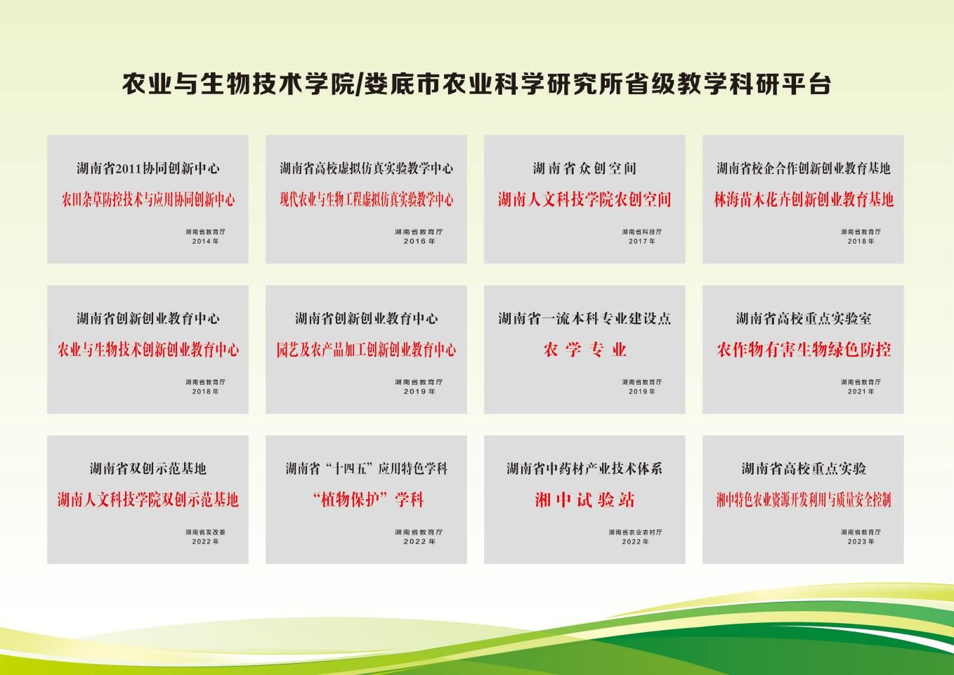 今年会农业与生物技术学院、娄底市农业科学研究所(简称院所)是实行院所“两块牌子、一套人马”管理体制的教学科研单位。娄底市农业科学研究所前身为成立于1943年的农林部华中区农业推广繁殖站,2007年11月整体归并今年会,2008年2月成立学校农科所和生命科学系,其中学校农科所与娄底市农业科学研究所合署办公。2014年8月,学校农科所与生命科学系重组,更名为农业与生物技术学院,与娄底市农业科学研究所合署办公。历经82年的建设和发展,院所已成为具有现代农科特色的教学科研单位。