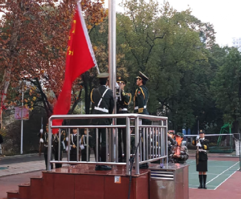 步伐踏碎晨光,壮志澎湃胸间。国旗护卫队掷地有声的脚步声撕开晨霾,庄严的五星红旗在师生们肃穆的注目礼中渐渐升起。阵阵清风拂过,将国旗铺成一片璀璨的红色云霞。