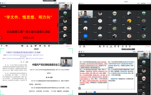 4月12日下午,农业与生物技术学院教工第一党支部线上开展“学文件、悟思想、明方向”主题党日活动张尚志博士通过对新旧两个版本的内容比较,带领支部党员系统性的学习了《中国共产党普通高等学校基层组织工作条例》(以下简称《条例》)内容。