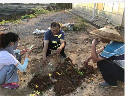 基地负责人向康林峰一行介绍了情况,目前棚内苗木存在整株黄化的现象,希望技术团队能给予技术指导。康林峰现场将苗钵解封察看树苗根系情况,对黄化情况进行了分析,并给出了补救的技术方案。随后,团队一行察看了金秋砂糖橘幼树栽培基地。据基地负责人介绍,金秋砂糖橘已经有四年树龄,理应结果,而目前呈现只长树不结果现状。技术团队组现场进行了深入探讨、分析,对提高坐果率的技术措施进行指导并现场示范操作了幼树整形修剪技术。