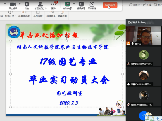 7月3日,农业生物与技术学院园艺教研室通过腾讯会议平台在线召开了2017级园艺专业毕业实习工作动员大会,就毕业实习工作主要事项做了总体安排。17级园艺专业全体学生参加了会议。
