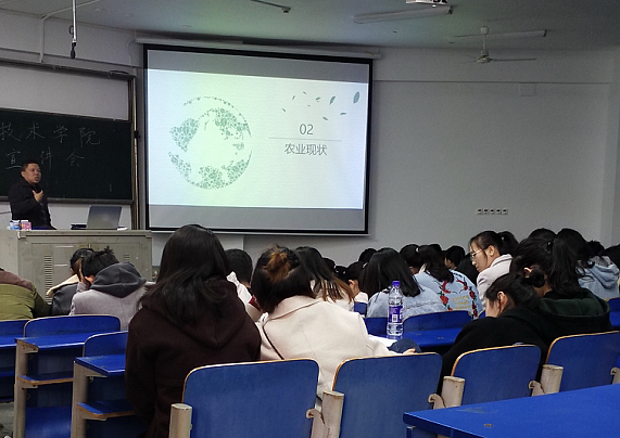 12月10日下午,我院邀请广东中迅农科股份有限公司人力资源部部长禹峰给我院17级和18级学生做就业创业专题讲座。讲座前,我院辅导员聂恒老师介绍了禹峰老师的个人情况,工作经历等。之后禹峰部长结合农学专业情况,用大量数据就就中外种植差异,在种植地域情况、第一产业工作人员受教育情况、粮食产量等方面向我院学生做了一个全面的介绍, 语言风趣幽默,师生互动性好。