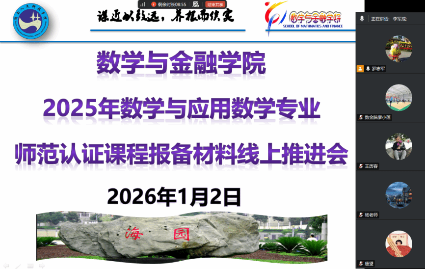1月2日晚,学院通过腾讯会议召开数学与应用数学专业师范认证持续改进课程报备材料提交工作推进会,院长李军成、数学与应用数学教研室主任吴斯、相关课程负责人参加,会议由副院长罗志军主持。