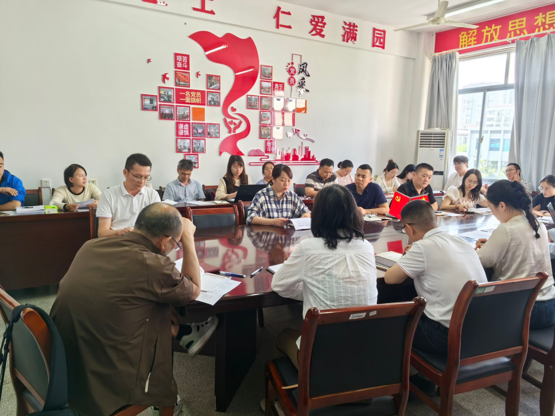 (全体教职工认真聆听党课)