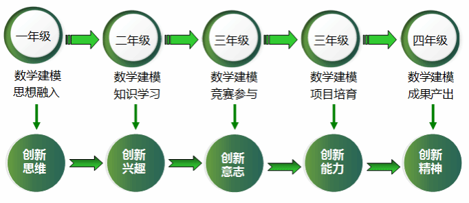 今年会作为一所年轻的地方本科院校,虽然受到了办学历程、地理位置、师资力量、生源质量、经费不足等各方面因素的制约,但该校数学建模教研团队在依托数学建模培养创新人才方面走出了新路子,构建了数学建模“一条龙”模式,即通过数学建模思想融入(一年级)、数学建模知识学习(二年级)、数学建模竞赛参与(三年级)、数学建模项目培育(三年级)、数学建模成果产出(四年级)五个阶段的联动作用循序渐进地培养学生的创新思维、创新兴趣、创新意志、创新能力和创新精神。