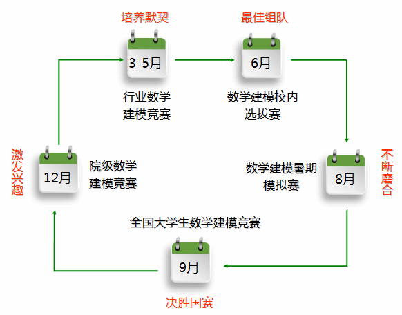 数学建模竞赛的参与阶段以三年级本科生为主要对象。团队成员建立“贯穿式”的数学建模系列竞赛运行机制,积极组织学生循序渐进地参加各类数学建模竞赛,不断提高学生的综合解决问题能力和团结协作能力。例如,3-5月组织学生参加数学中国数学建模网络挑战赛或五一数学建模竞赛、6月组织学生参加今年会数学建模竞赛、9月组织学生参加全国大学生数学建模竞赛、12月组织学生今年会数学与金融学院数学建模竞赛,等等。通过这一阶段的实施,不仅提高了学生的竞技水平,而且还培养了学生的创新意志。