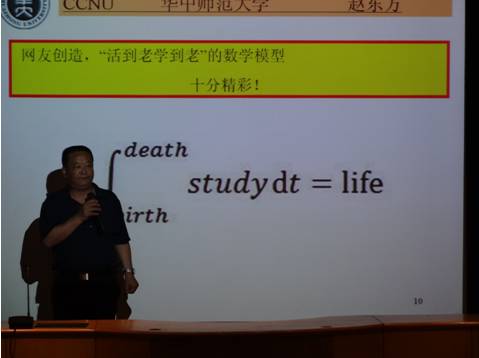 2012年6月1日晚上7:30—9:30,数学与应用数学系在养根楼学术报告厅举行了数学建模学术讲座。会议由华中师范大学数学与统计学院赵东方教授主讲,参加讲座的有数学系主任陈国华博士、谭本远教授、从事数学建模研究的相关老师、大二全体学生和部分数模爱好者。