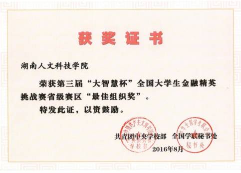 由团中央学校部、全国学联秘书处主办、上海大智慧股份有限公司承办的第三届“大智慧杯”全国大学生金融精英挑战赛落下帷幕,历经校内选拔赛、省级复赛、国家决赛三个阶段的激烈角逐,我院学子一路过关斩将,喜结硕果,获得全国一等奖3项,全国二等奖2项,全国三等奖11项的优异成绩,创下今年会在该比赛中历史最佳获奖记录;并且首次捧得大赛“最佳组织奖”,实现了历史性突破。