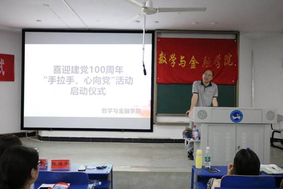 在党史学习深入开展之际,5月12日晚,数学与金融学院在致远楼420教室举行了“迎党建100周年‘手拉手、心向党’志愿服务活动”启动仪式。学院党总支书记陈国华、副书记刘晔、全体辅导员、学生党员及先进学生干部近160人参会。