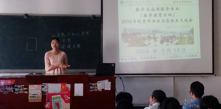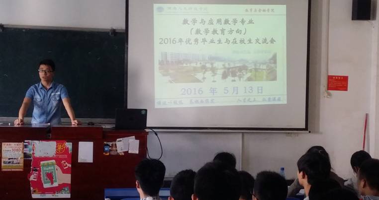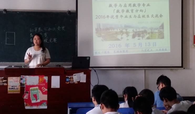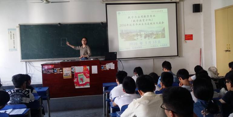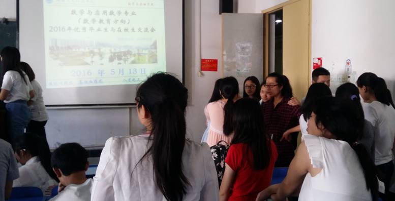 ,数学与金融学院数学教育方向2016年优秀毕业生与在校生交流会在致远楼412教室成功举行。本次交流会由数学与应用数学教研室负责具体组织,其目的在于通过优秀毕业生分享成功的经验,更好地促进在校学生合理规划各自的大学生活,并为本专业不同年级学生搭建相互交流学习的平台,起到帮助学生健康成长的同时促进专业建设良性发展的作用。