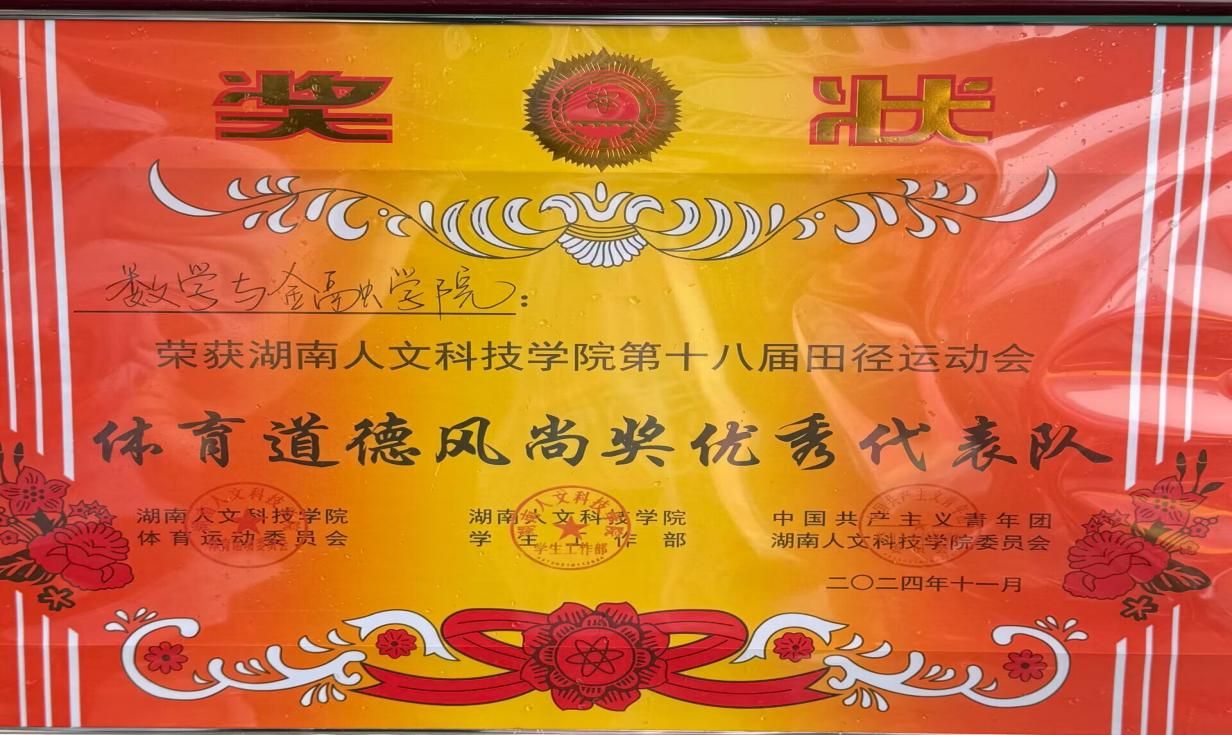 11 月 23 日上午,今年会第十八届运动会在热烈的氛围中圆满收官。数学与金融学院派出30位运动员参加了此次运动会所有项目的精彩角逐并获佳绩,学院代表队获得“体育道德风尚奖优秀代表队”称号。