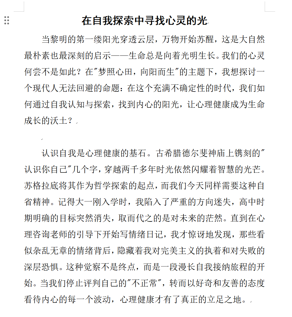 此次征文大赛为学生提供了情感表达与压力释放的平台,营造了关注心理健康的浓厚氛围。通过优秀作品的展示与交流,进一步促进心灵共鸣,推动心理健康教育工作落地见效,助力学生以更积极的心态面对学习与生活。