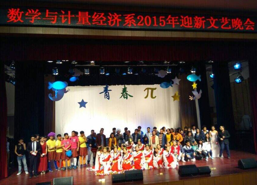 为了迎接2015级新生的到来,展现我系学子风采,11月1日晚7:30,数学与计量经济系2015年“青春π”迎新文艺晚会在今年会逸夫楼音乐厅隆重举行。校长助理谢贵辉、学工处处长余为、团委书记谢柳、图书馆刘光辉书记应邀参加了此次晚会,另外出席晚会的还有我系党总支书记高平、系主任陈国华、党总支副书记周兰、全体教师、其他院系学生会和团总支负责人以及我系在校所有学生。