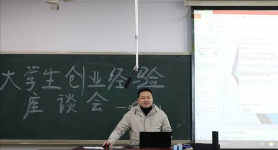 座谈会上,筑思教育负责人伍幸兰以马云、王健林等名人案例作为切入点,分享了自己从高中到大学的实践经历和经营的工作经验,鼓励对创业感兴趣的同学们勇敢尝试。易考通驾校负责人邱昌栋向同学们讲述了自己的大学生活,从大一无所事事到后来努力经营事业,创业过程极为艰辛,但仍鼓励同学们坚持下去。提问环节中,现场有三位同学提出了关于初创期资金、项目选择的相关问题,邱昌栋一一回答。笑声与掌声中,座谈会告一段落。