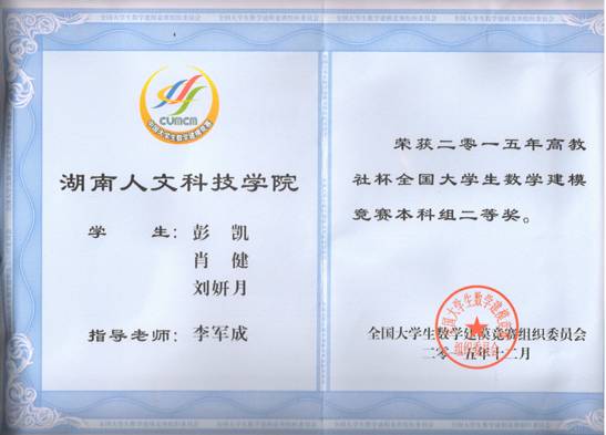 信息与计算科学教研室老师多年来积极指导学生参加各类学科竞赛并取得优异成绩。其中指导学生参加全国大学生数学建模竞赛获全国一等奖2项、全国二等奖3项、省级三等奖以上10多项。指导学生参加“挑战杯”大学生课外学术科技作品竞赛获省级三等奖1项、校一等奖1项、校二等奖2项,校三等奖5项。4次获得校“挑战杯”竞赛优秀指导教师。