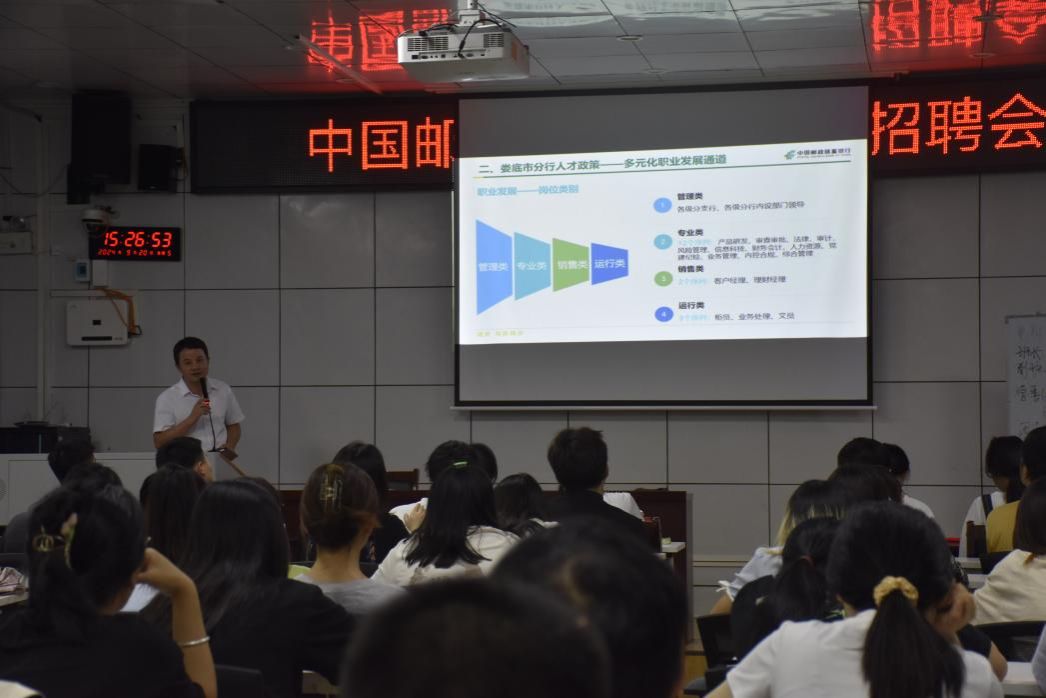 稍后的互动环节,同学们咨询了有关晋升、具体工作地点等一系列问题,廖经理耐心为同学们一一作了解答,让同学们对中国邮政储蓄银行有了更加细致的了解。