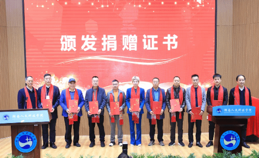 大会现场,付胜龙校友向校友基金会捐款100万元,袁伟峰校友捐款50万元,以实际行动支持学校的教育发展,并被授予捐赠证书,其捐款将会惠及师生、造福学校。