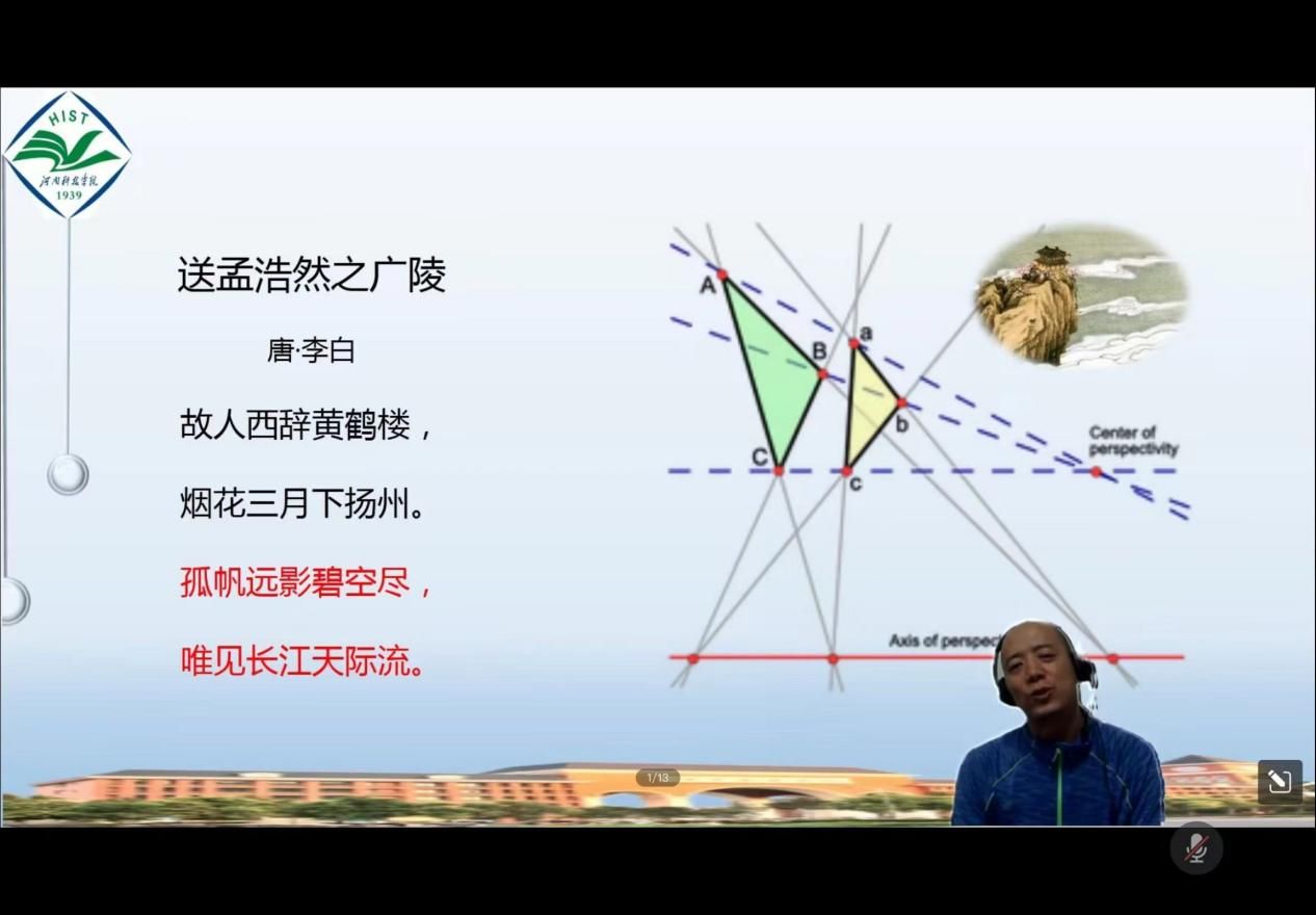 4月25日晚,河南科技学院数学科学学院党委副书记马宝林应邀通过腾讯会议平台开展以“美学·文学——让数学遇见”为主题的讲座,副院长龙志文主持,部分学生参加。