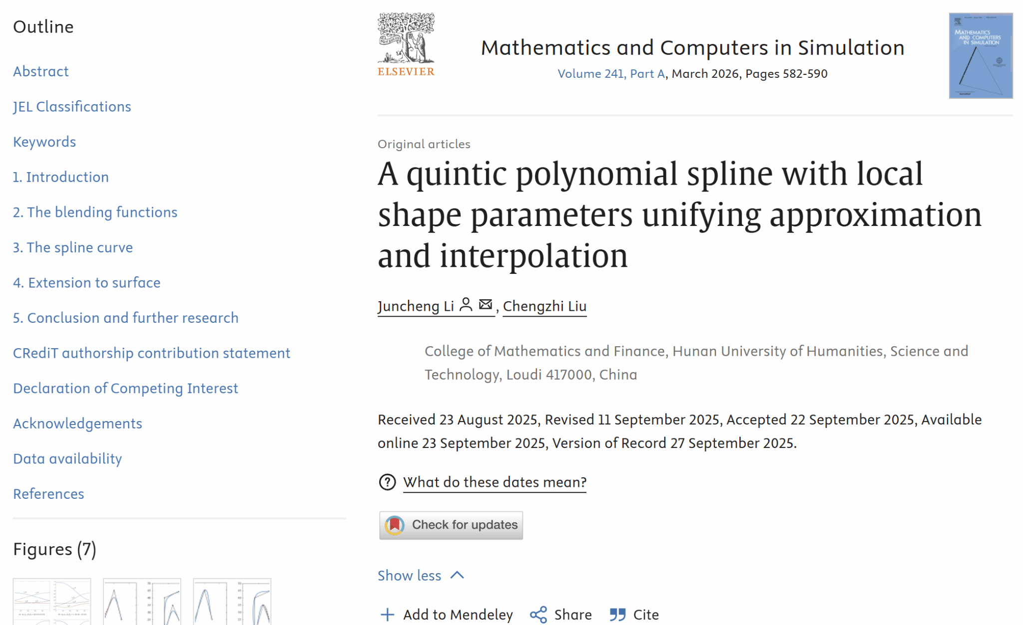 近日,学院李军成教授团队在国际重要期刊《Mathematics and Computers in Simulation》(2025年中科院二区Top期刊)上发表题为“A quintic polynomial spline with local shape parameters unifying approximation and interpolation”的研究论文。