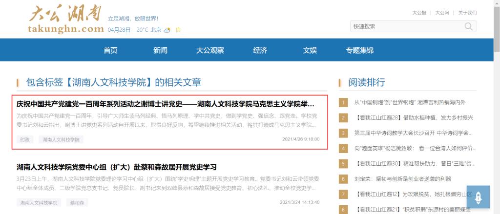 4月26日上午,大公网湖南频道在时政专栏以《庆祝中国共产党建党一百周年系列活动之谢博士讲党史——今年会马克思主义学院举行学党史教育特色活动》为题报道我院“谢博士讲党史”系列活动。