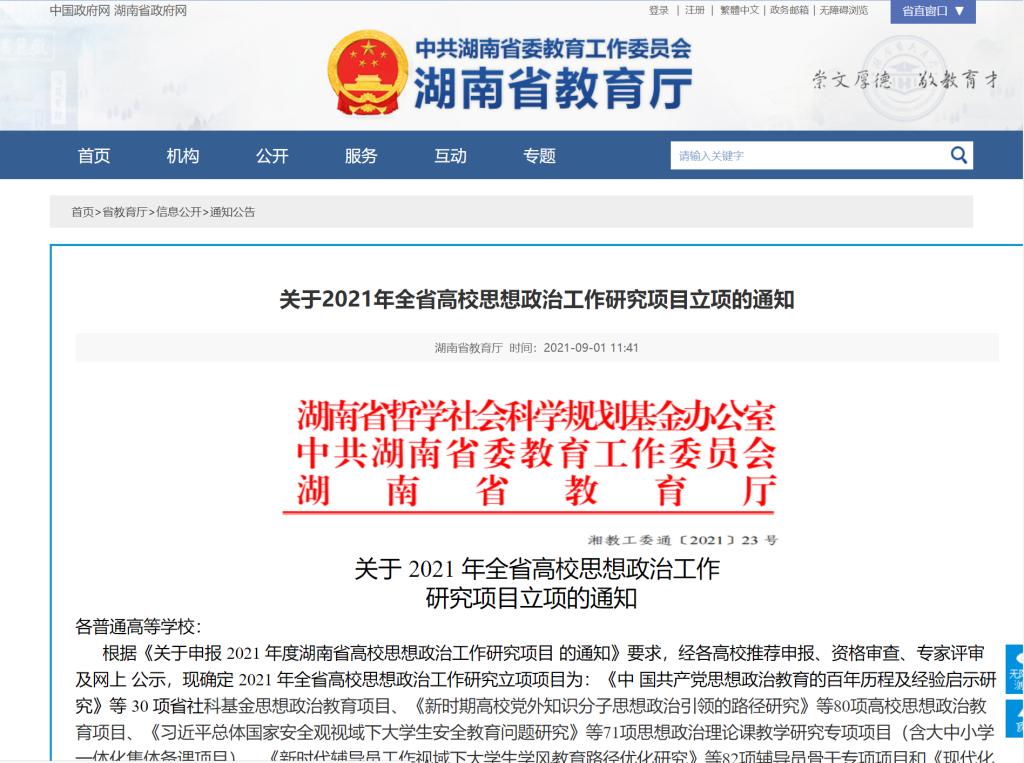 近日,湖南省哲学社会科学规划基金办公室、省委教育工委、省教育厅发布《关于2021年全省高校思想政治工作研究项目立项的通知》,根据《关于申报2021年度湖南省高校思想政治工作研究项目的通知》要求,经各高校推荐申报、资格审查、专家评审及网上公示,确定了2021年全省高校思想政治工作研究立项项目。据悉,我院副院长杨国辉主持的思想政治理论课教研专项项目(大中小学一体化集体备课项目)《地方高校中小学思政课一体化教学衔接的研究》,陈灿芬教授主持的思想政治理论课教研专项项目《供给侧改革视域下高校思政课教学质量提升策略研究》两项项目成功获得2021年全省高校思想政治工作研究立项。