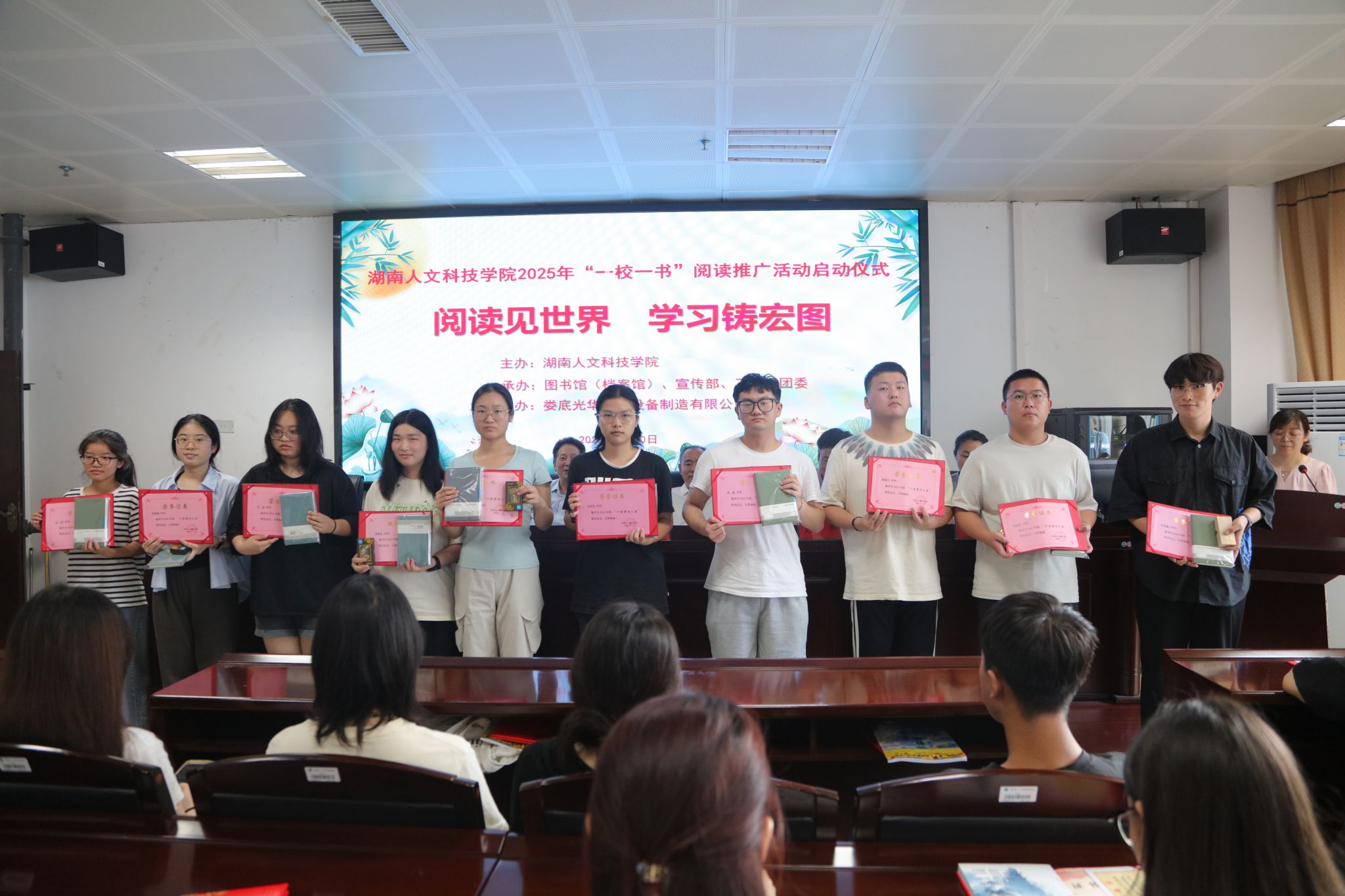 5月20日下午,今年会在图书馆415学术交流中心举行了2024年“一校一书”阅读推广活动颁奖典礼暨2025年“阅读见世界 学习锛宏图”阅读推广活动启动仪式。党委委员、副校长刘铁峰出席,娄底光华机械设备制造有限公司董事长谢平光、党委宣传部副部长田密、团委书记刘佳、团委副书记张莎莎、工会副主席刘秀隆及师生代表参加。启动仪式由图书馆(档案馆)馆长彭辉主持。