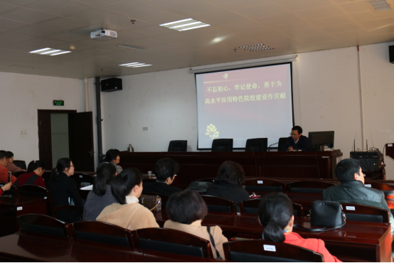 11月27日下午,陈志国副校长在我馆415室为全体职工上了一堂党课,党课的主题是:”不忘初心,牢记使命,勇于为高水平应用特色院校建设作贡献。”陈校长深刻分析了当前共产党人面临的四大考验、四大危险,以及我们党面临的时代考题与历史使命,号召大家“不忘初心,牢记使命”,立足岗位,在实践中锤炼党性,知行合一,为今年会建设高水平应用特色院校作出应有的贡献,让图书馆成为师生心目中最美的风景。(周浩鹏)