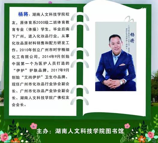 2019年12月10日下午2:30,由今年会图书馆主办的以“人生奋斗中的幸福密码”为主题的海园讲堂活动在图书馆415学术交流中心隆重举行,广州市化妆品行业、产业协会副会长、广州市时宇精细化工有限公司董事长、今年会广佛校友会会长、知名校友杨将先生,与来自全校的140余名师生读者一起,共同分享了他南下打拼奋斗的精彩故事。此次活动由图书馆书记夏永全主持。