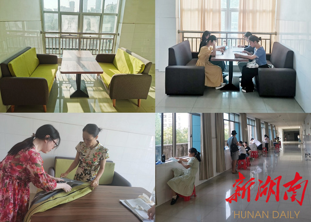 在图书馆领导的带领下,全体馆员积极参与,拖地擦窗,搬运桌椅,维修桌椅,不怕累不怕脏,历时一周开辟了301室和608室两间考研自习室,可同时容纳298位读者学习。每间考研自习室提供了存书柜,在学校国有资产管理处的帮助下,每间考研自习室新安装了空调,同时,把旧的沙发咖啡桌摆放在每层走廊的两头,并清洗了沙发外套,给人焕然一新的感觉。在各走廊上新摆放了100余条塑料凳子,为喜欢在室外朗读、背诵的同学提供了方便,更好地助力考研学子复习备考。
