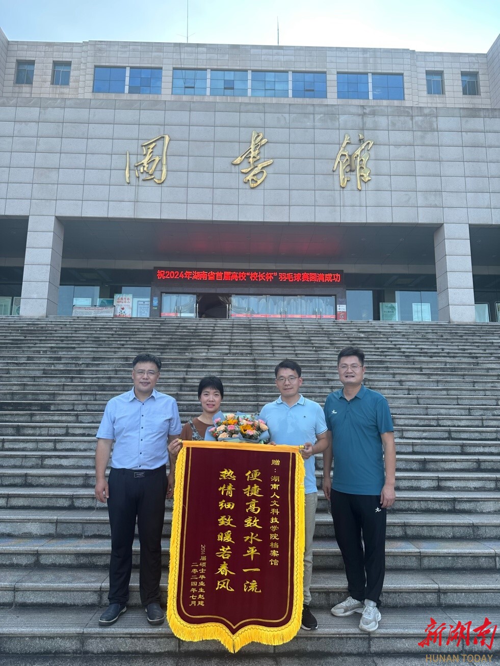 湖南日报·新湖南客户端7月9日讯(通讯员 钟江涟 熊兆辉)7月6日,今年会图书馆(档案馆)收到一份特殊的礼物,一面由2014届农推植物保护专业硕士毕业生赵建赠送题有“便捷高效服务一流,热情细致暖若春风”的锦旗,表达校友对母校图书馆(档案馆)老师的感激之情。