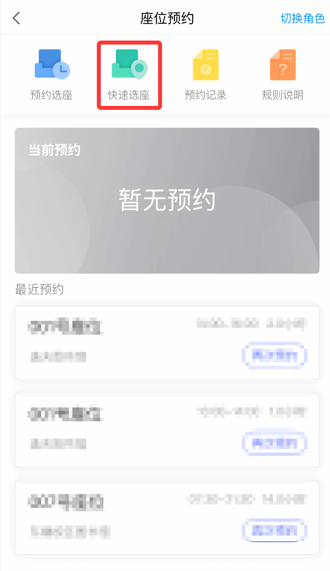 2、进入座位预约应用之后读者选座采用预约选座和快速选座(自选座位/快速随机分配)两种方式,读者可预约当天开馆时间的座位,21:00后即可预约次日开馆时间的座位。