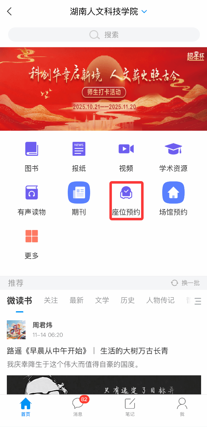 1、读者通过手机下载安装超星学习通APP,用手机号注册登录之后,绑定单位属性,通过学校应用首页输入邀请码:hnrwkjxy或者在首页切换单位,进入座位预约的应用主界面