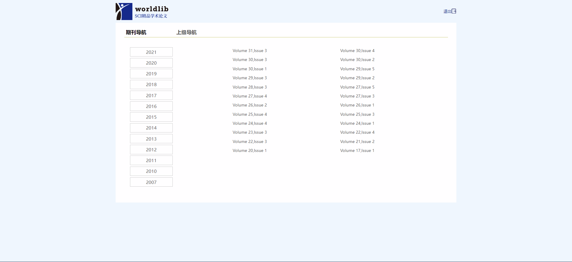 (2)期刊导航页,根据首字母排序,可以进行期刊名检索。点击选择期刊可以打开该期刊的期卷列表。