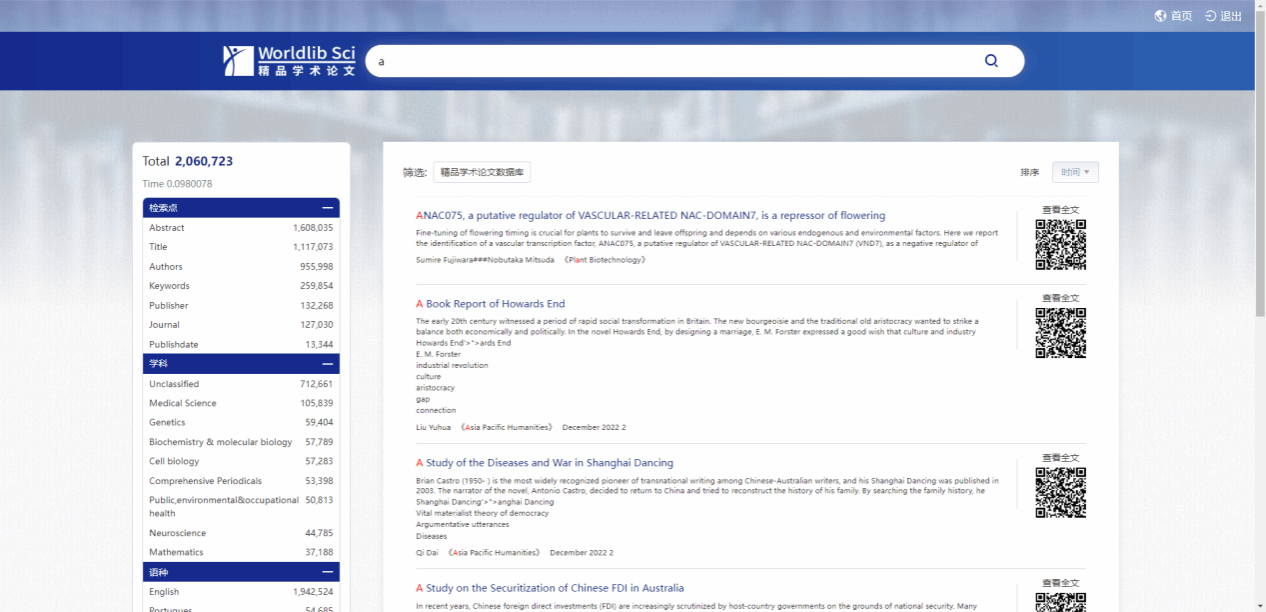 (3)首页检索直接进入检索列表页(如下图),可以按照检索点、学科、语种、年限等聚合项实现二次检索。可以按照时间、相关性进行排序。可以用手机扫描右侧的二维码进行移动阅读。