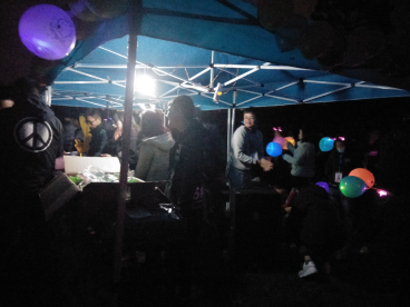 (本站讯:杨浩圣、梁露) 2017年10月18日晚定向越野协会在老田径场举行了篝火晚会。现场的音乐和同学们的热情都掩盖了冷冷的天气。亮着光的气球与发光的独角兽让黑暗的田径场也充满着五彩斑斓的灯光。不管是现场的氛围还是现场的布置。都可以看出每个人都期待着将要到来的篝火晚会。