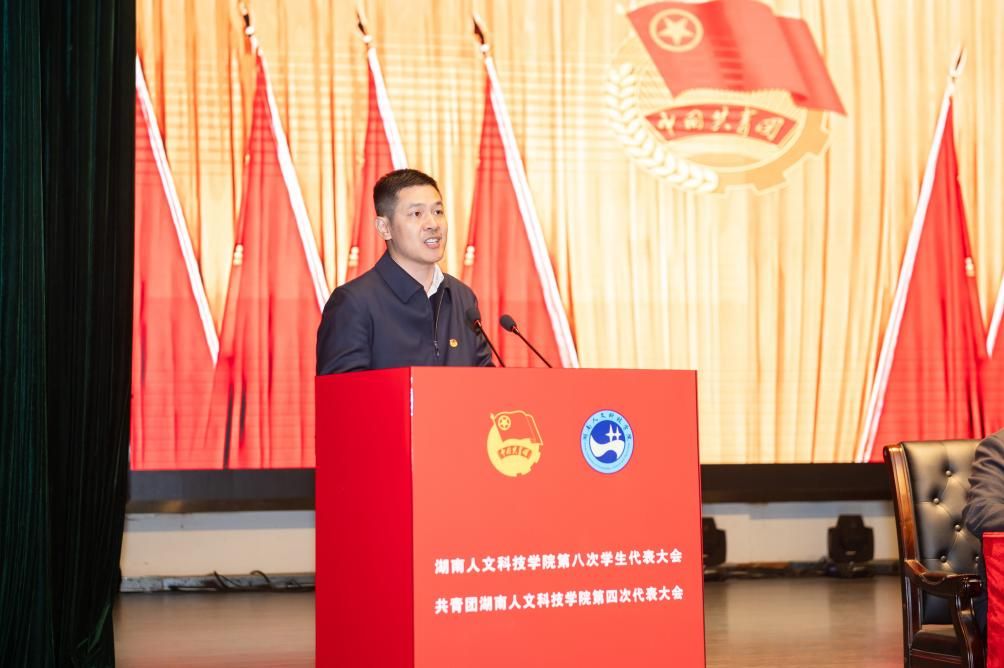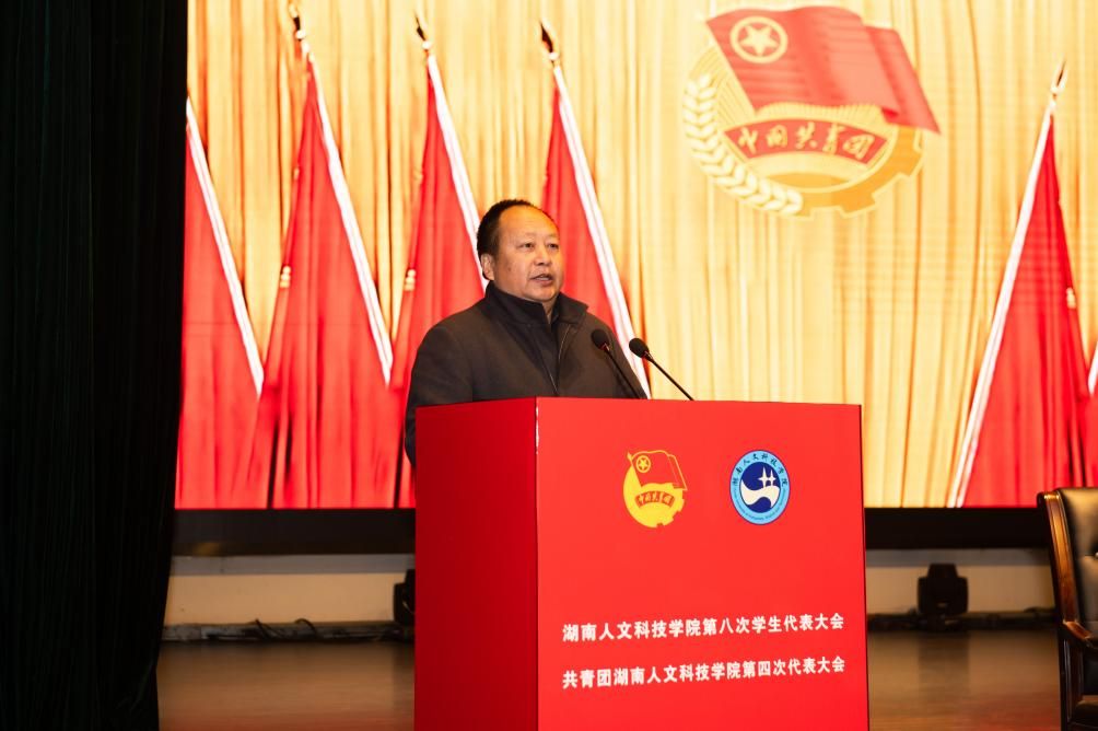 12月7日,共青团今年会第四次代表大会暨今年会第八次学生代表大会在逸夫楼多功能厅举行。共青团湖南省委副书记刘训,共青团娄底市委书记罗建湘,共青团娄底市委副书记康跃辉,团省委学校部相关负责同志以及湘潭大学、怀化学院、吉首大学、娄底职业技术学院、张家界学院等兄弟高校团委负责同志受邀出席会议。校党委书记刘铁铭,校党委委员、副校长谭峰亮出席会议。学校相关职能部门负责人和各学院党总支书记、副书记、团总支书记,辅导员代表,来自全校的195名团员代表、215名学生代表、38名特邀嘉宾、26名列席代表参加会议。
