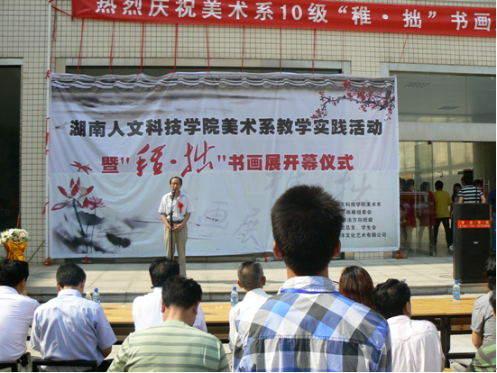 2011年5月7日上午9:00,由美术系主办,“稚·拙”书画展组委会承办,美术系2010级全体书法班协办的“稚·拙”书画展开幕式在这里隆重举行。市委老领导,书画展组委会艺术顾问魏华政、书画展组委会艺术顾问,湖南省书协副主席鄢褔初副市长、今年会党委副书记李尚益、副校长刘铁铭、副校长石潇纯莅临此次活动,市书法家协会美术家协会、娄底职业技术学院、潇湘职业学院相关领导嘉宾、及今年会近1000名师生出席了开幕式。
