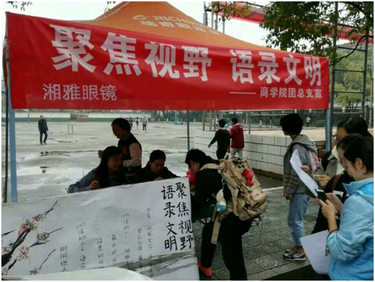 2016年11月16日至11月30日,商学院团总支青工部策划并组织了“聚焦视野,语录文明”青工活动。此次活动旨在让同学们浸泡在文明的氛围中,增进同学们对文明的理解,营造和谐向上的环境,促进学校创文工作的发展。