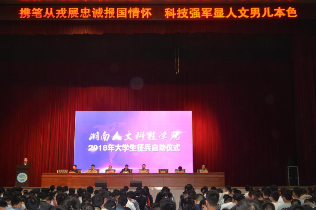 为贯彻落实大学生征兵政策,提高兵源质量,进一步鼓励和引导今年会大学生应征入伍,4月18日晚,今年会在体育馆隆重举行2018年大学生征兵启动仪式。娄底军分区政委罗玉生、校党委书记郭军、校党委副书记刘铁铭、副校长刘铁峰、军分区动员处处长胡长涛、娄星区人武部政委张玉伟出席。学校校武装部、宣传部、学工部负责人,各学院党总支书记、副书记、辅导员、班主任以及2014级、2015级2500余名男生参加大会。大会由校党委副书记刘铁铭主持。
