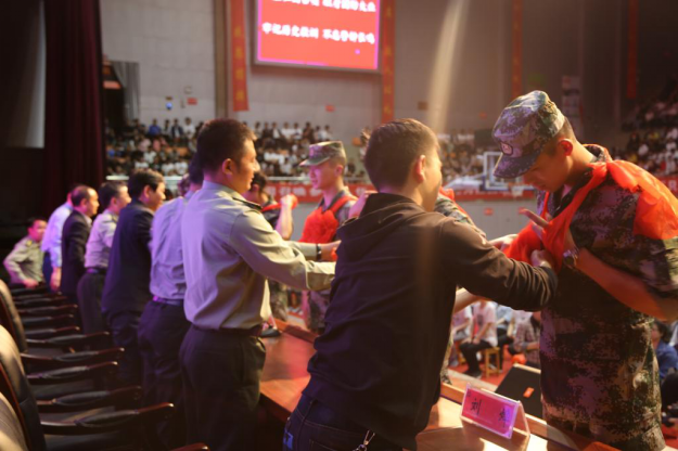接着由主席台上领导为退役大学生士兵佩戴光荣花,充分表达了学校对退役大学生士兵的关爱与崇敬。