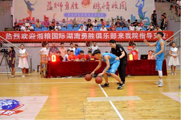 为增强师生身体素质,促进学校篮球水平提高,提升全院师生的篮球兴趣爱好,5月18日下午,湖南唯一的职业篮球俱乐部,湖南湘粮国际勇胜篮球俱乐部金健米业队来今年会体育馆举行职业体育进校园活动。本次活动由今年会主办,娄底市篮球协会、今年会体育学院、今年会工会、今年会团委、娄底翼腾体育文化发展有限公司、湖南勇胜篮球俱乐部承办。