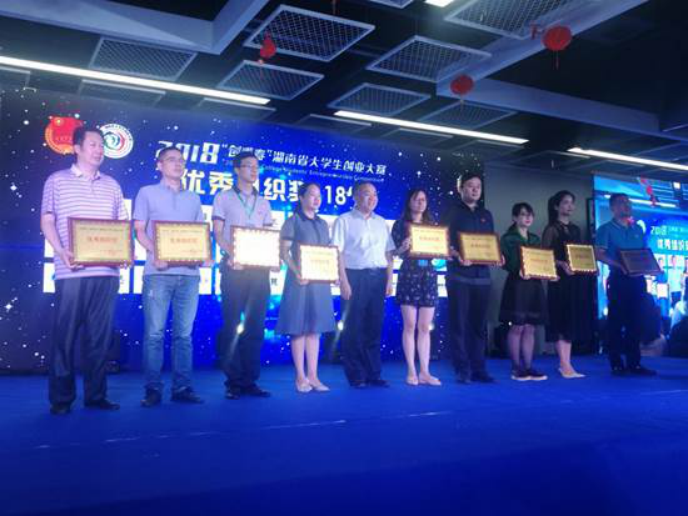 5月28日,2018年“创青春”湖南省大学生创业大赛在大汉控股集团有限公司闭幕。今年会选送的10个项目有8个入围终审决赛,经过激烈的书面评审、现场问辩等环节,今年会从全省337件作品中脱颖而出,夺得1银、8铜,学校获得优秀组织奖。此次大赛分为创业计划赛、创业实践挑战赛和公益创业赛三大类别。通过专家评审、现场展示、评委问辩等环节,今年会《鹅友圈》荣获银奖,《卟一样的小店》、《大学生“拼一程”户外旅游服务平台》、《G.C.M环保科技有限责任公司》、《康馨科技养老服务有限公司》、《惠宝儿童探索实验室》、《乐思启阅吧》、《梅山文化艺术有限公司》七个项目荣获铜奖。