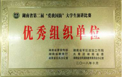 近日,由湖南省委宣传部、省军区政治工作局、省教育厅、共青团省委、省征兵和省国教办联合组织开展的历时近三个月的第二届“爱我国防”全省高校大学生主题演讲大赛落下帷幕,今年会对大赛高度重视,深入宣传发动,精心组织开展,荣获优秀组织单位荣誉称号。