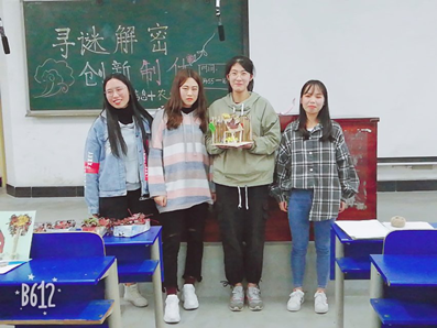 活动氛围两个环节,在“寻谜解密”环节中,参赛成员自行分为四人一组,通过主持人指定的动作夹破气球,找到气球中指定的卡片并回答问题。“创新制优”环节,比赛时间共为80分钟前20分钟由代表人员进行材料的观察及选择。后60分钟为参赛团队做出自己团队想要创作的手工物品。经过评审,一个团队的创意设想打动了评委,她们说:“因为自己都是独自身处在异乡,只有寒暑假才可以回到家乡,所以希望自己的寝室就是自己温暖的家,室友就是熟系的家人。通过这个创意,用所选材料做出了一个房子,寓意每个人都能有个温暖的小房子。