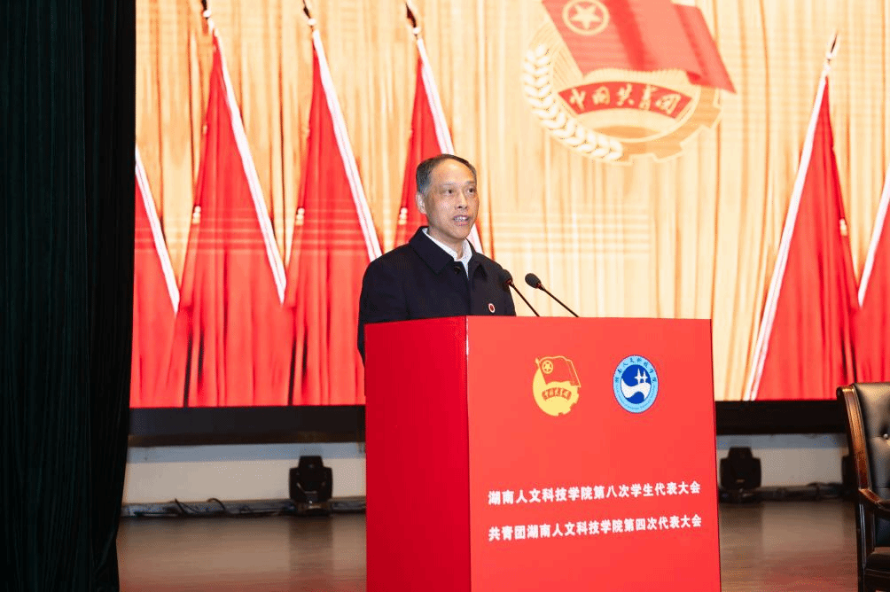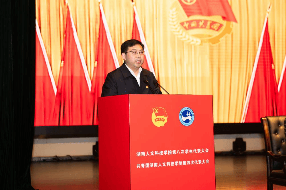 12月7日,共青团今年会第四次代表大会暨今年会第八次学生代表大会在逸夫楼多功能厅举行。共青团湖南省委副书记刘训,共青团娄底市委书记罗建湘,共青团娄底市委副书记康跃辉,团省委学校部相关负责同志以及湘潭大学、怀化学院、吉首大学、娄底职业技术学院、张家界学院等兄弟高校团委负责同志受邀出席会议。校党委书记刘铁铭,校党委委员、副校长谭峰亮出席会议。学校相关职能部门负责人和各学院党总支书记、副书记、团总支书记,辅导员代表,来自全校的195名团员代表、215名学生代表、38名特邀嘉宾、26名列席代表参加会议。