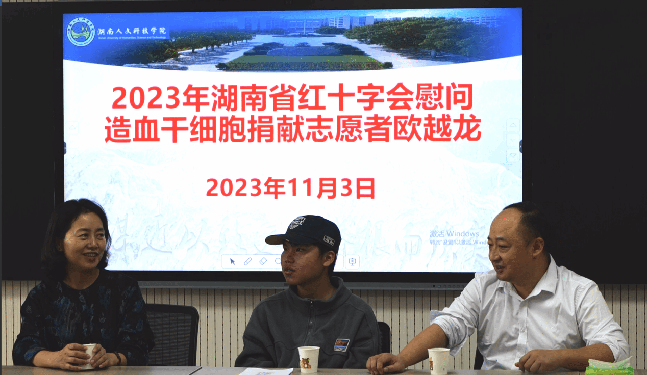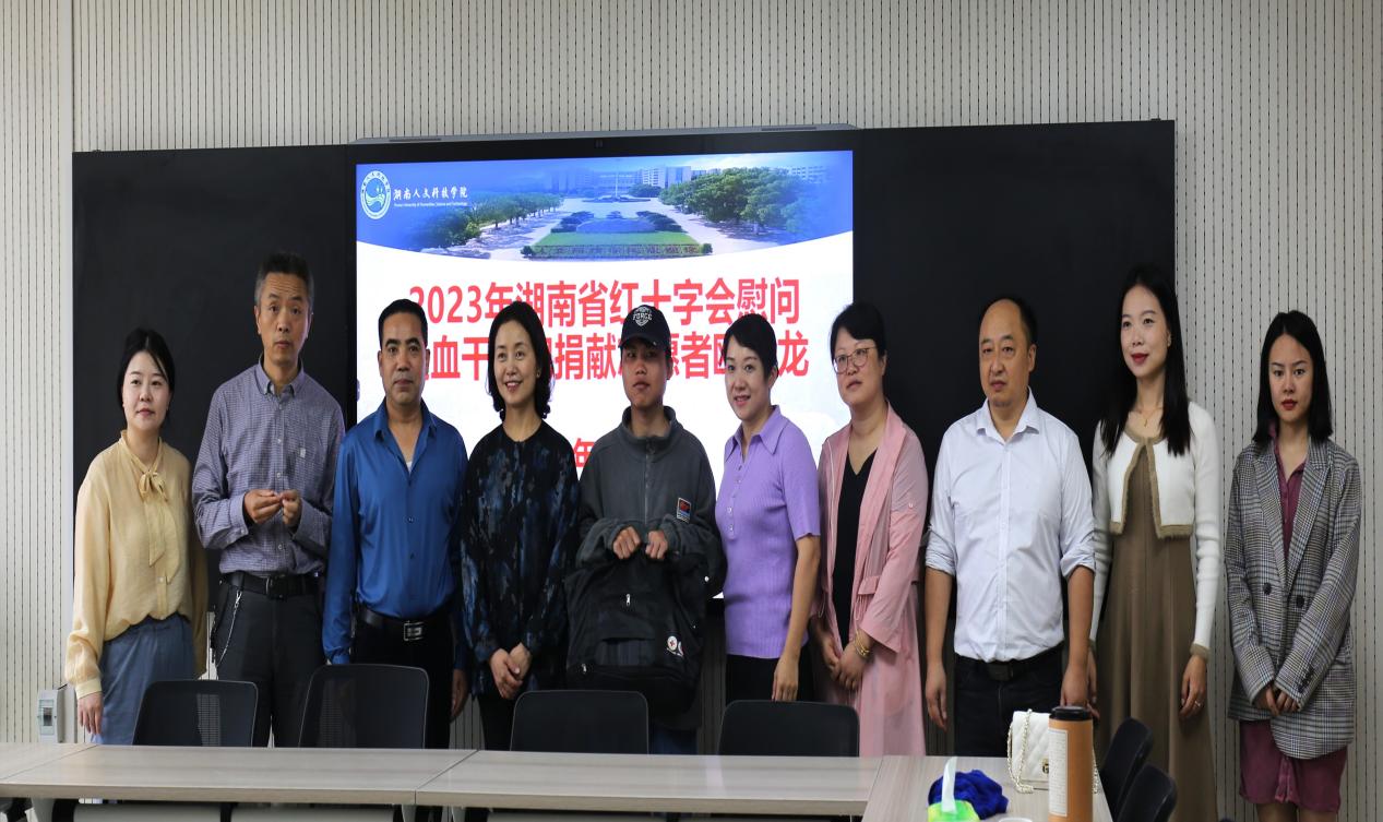 为大力弘扬红十字会“人道、博爱、奉献”的精神,11月3日上午,湖南省红十字会来今年会慰问造血干细胞捐献志愿者欧越龙同学。湖南省红十字会党组成员、副会长邱梦丹,湖南省造血干细胞捐献者资料库管理中心主任张赞、湖南省造血干细胞管理中心卓林悤,市红十字会党组成员、副会长李林华,市红十字会秘书长刘鸥,娄星区常务副会长严希、副会长熊艳,校友办主任刘莉、校团委副书记刘佳、美术与设计学院副书记成伟及有关师生代表参与本次慰问会。